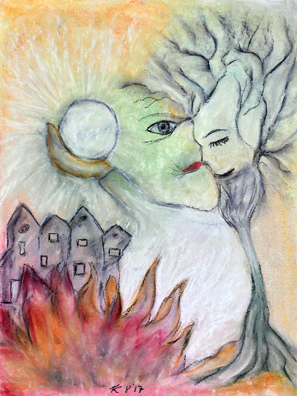 Interessant ist auch das Themenbild: „Stein der Weisen“. „Die Erfahrung tausender von Jahren lehrt uns, dass wir Menschen immer wieder eine Art Zerstörung oder Ende benötigen, um eine grundlegenden Erneuerung auf seelischer oder auch auf materieller Ebene zu erfahren“, so die Künstlerin weiter. „Ein zerstörerisches Feuer ist die Ursache für Neues, für eine Weiterentwicklung. Alte Gebäude, überholte Denkstrukturen gehen in Schutt und Asche auf und neues Leben, neue Möglichkeiten entstehen. Das Wissen darum wird von Generation zu Generation den Weisen und Sinnsuchenden weitergegeben – ist der sogenannte ‚Stein der Weisen‘.“