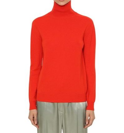 Genau meine Farbe und mein Geschmack ist der rote Kaschmir-Rollkragenpullover, der sich ebenfalls wunderbar zur grauen Hose kombinieren läßt.