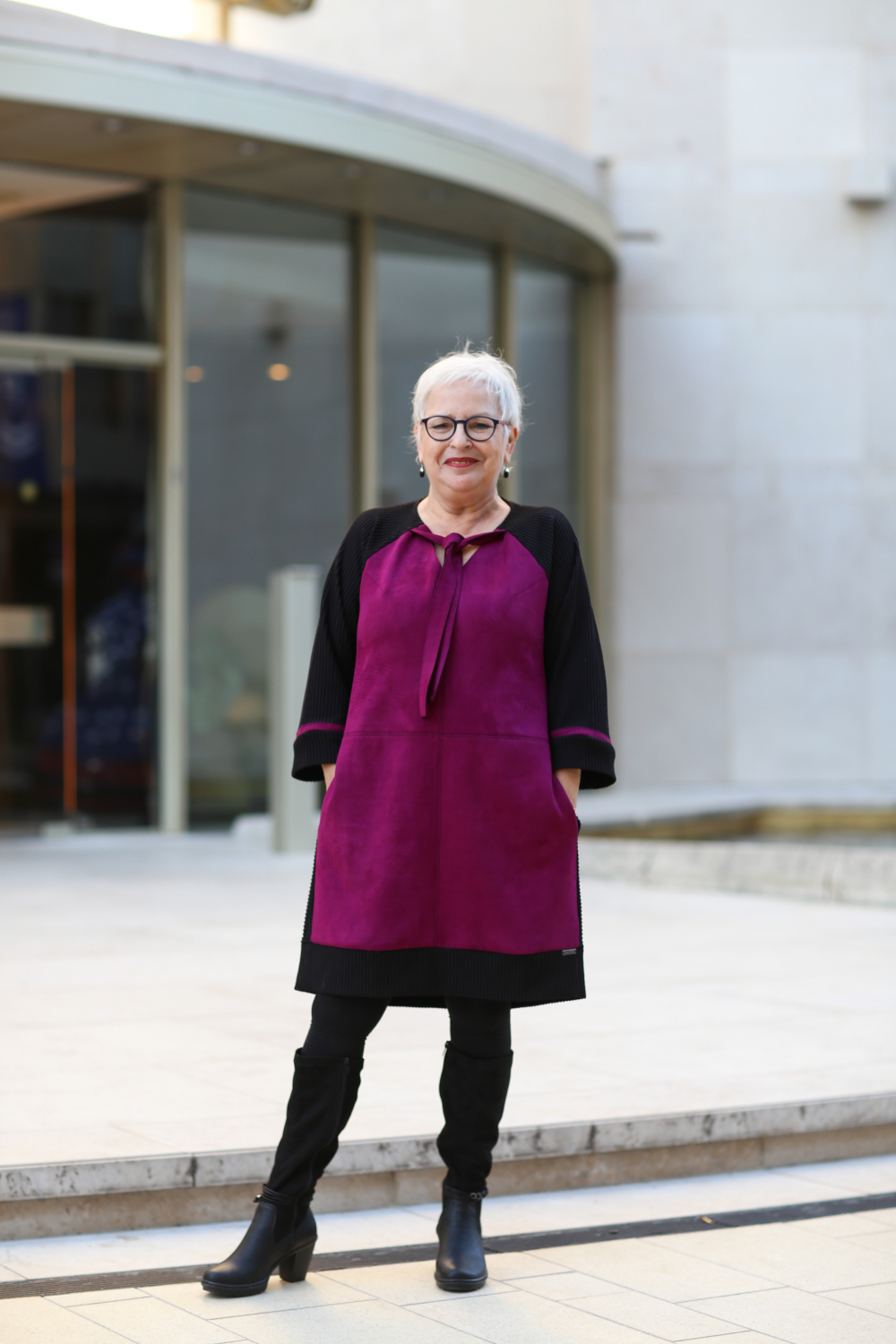 Ärmel und Rücken sind aus Strick. Das Vorderteil besteht aus einem Stoff in Wildlederoptik. Bei kälteren Temperaturen kann man auch wunderbar ein Langarmshirt oder einen Rolli darunter tragen.