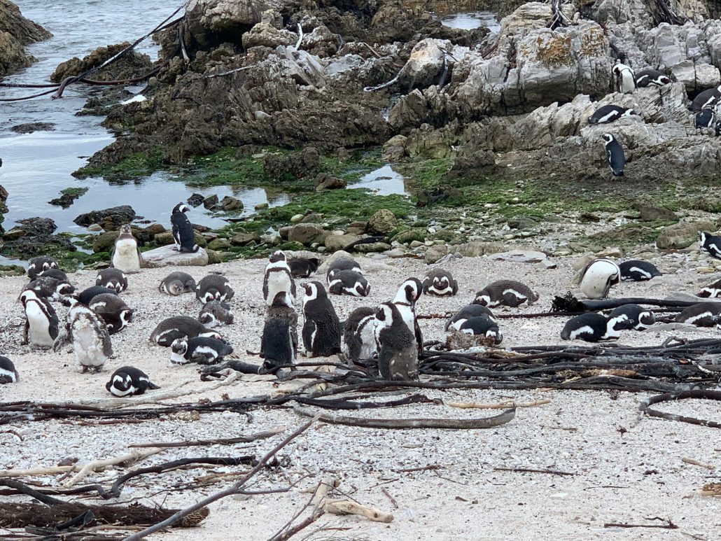 Wir machten uns also ein wenig traurig auf den Weg nach Kapstadt. Zum Frühstück gab es nur einen schnellen Kaffee und ein paar Kekse, denn auf dem Weg waren noch zwei schöne Etappen vorgesehen. Das erste Ziel waren die Pinguine in Betty`s Bay. Meine Güte, waren die süß und kein bisschen scheu. Obwohl hier eine Stunde eingeplant war, konnten wir uns kaum von den zauberhaften Wesen trennen.