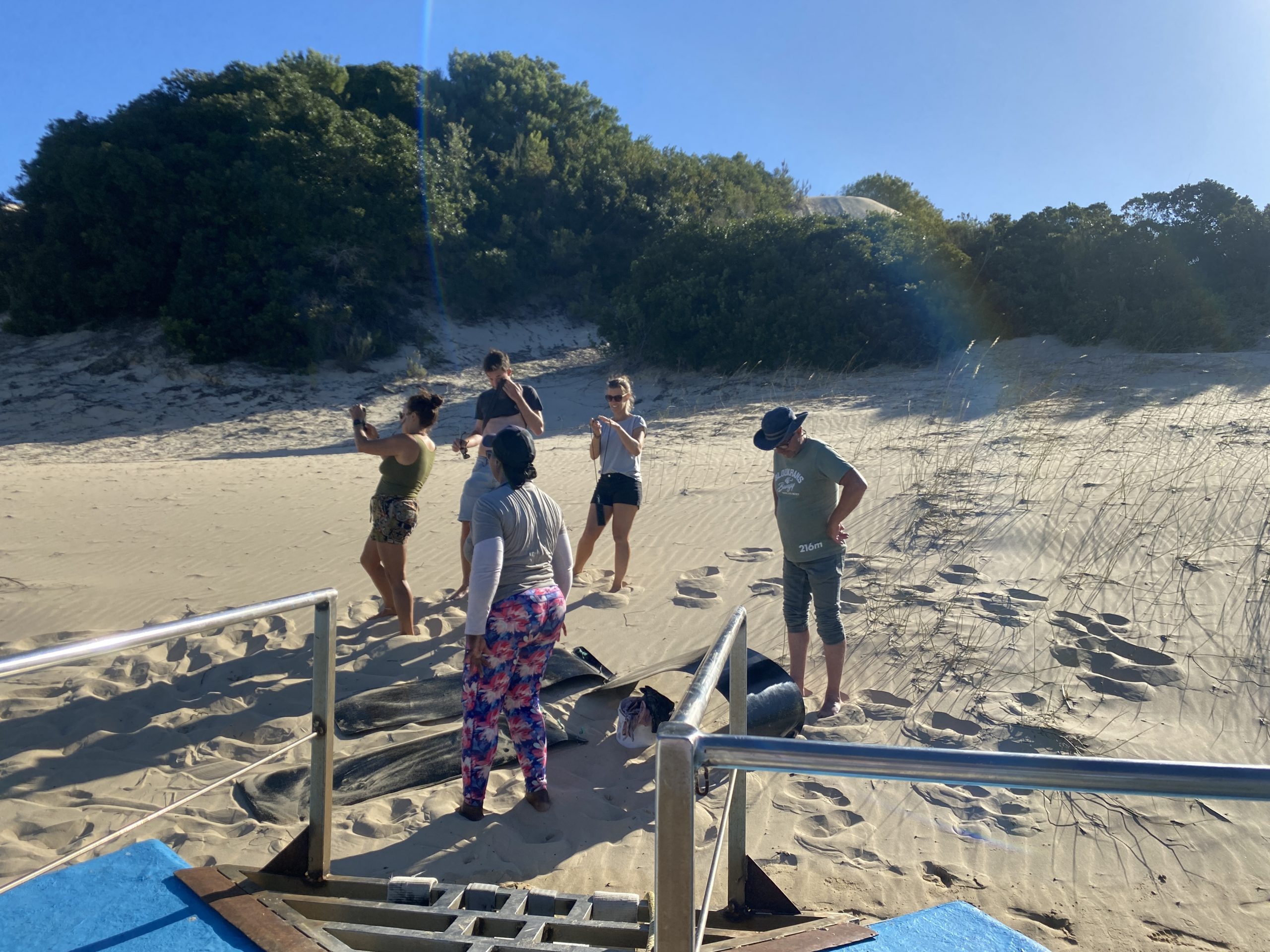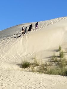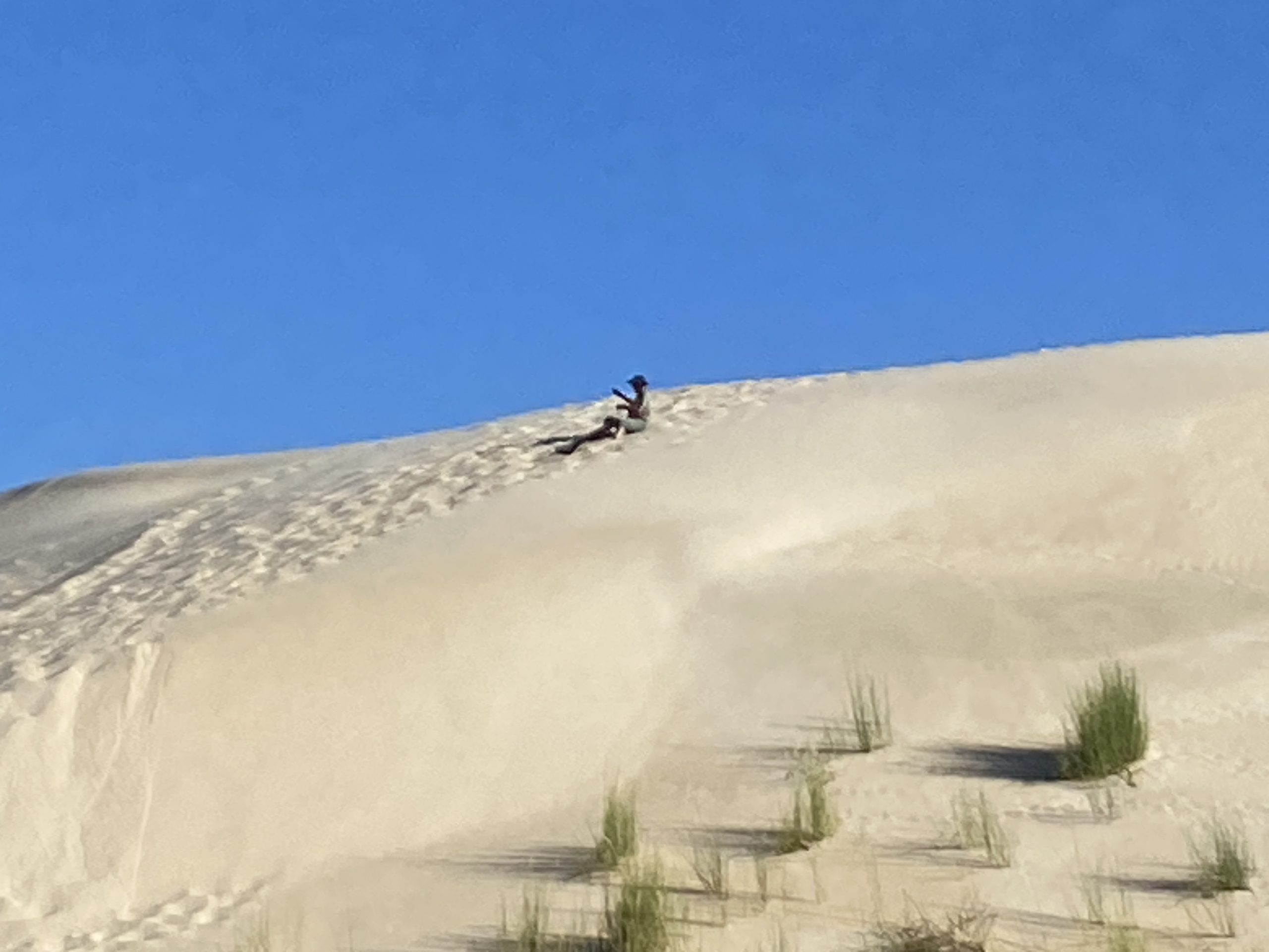 Bei einem Stopp gab es die Möglichkeit, eine der hohen Sanddünen zu erklimmen (hinter denen der Indische Ozean liegt) und anschließend auf einem Brett hinunterzurutschen. Runterrutschen? Sehr gern!