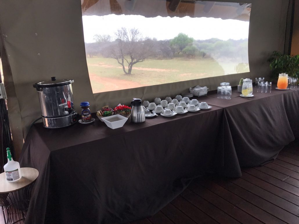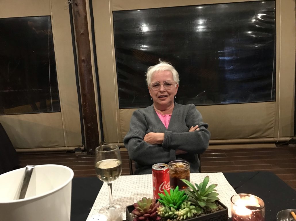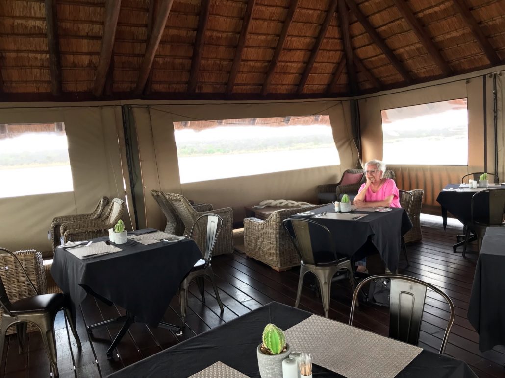 Am Abend sahen wir schon vom Zelt aus, dass es immer noch kein vernünftiges Licht im Speisesaal gab. Vorsichtshalber nahm Marion eine batteriebetriebene Lampe, die sie mitgebracht hatte, mit. Als wir ankamen, wurden wir in ein größeres Zelt geleitet. Nur für uns war dort gedeckt. Meine Schwester hatte dem Leiter des Ganzen am Vorabend die bereits erwähnte batteriebetriebene Lampe gezeigt und gesagt, dass er doch davon einige besorgen könne. Das hatte er wohl als Beschwerde aufgefasst und für uns diesen speziellen Platz reserviert. Wir hatten ein sehr leckeres Abendessen, als Abschluß dieser großartigen Safari, denn am nächsten ging es zurück nach Johannesburg. Genau zur richtigen Zeit, denn es wurde windig und regnerisch.