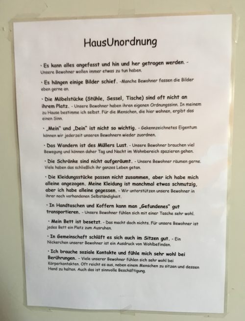 Auf mich wirkte das Zusammenleben erstaunlich harmonisch. Sicher legt sich schon einmal jemand in das falsche Bett, dann legt sich der “Bettinhaber” halt woanders hin. Alles ganz locker, was in Altenheimen mit “normalen” Bewohnern und Demenzkranken in der Gemeinschaft oft nicht ohne grosses Gezeter abgeht. Genauso locker ist die “Haus(un)ordnung”: